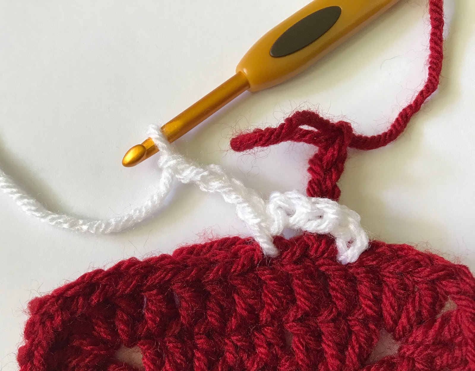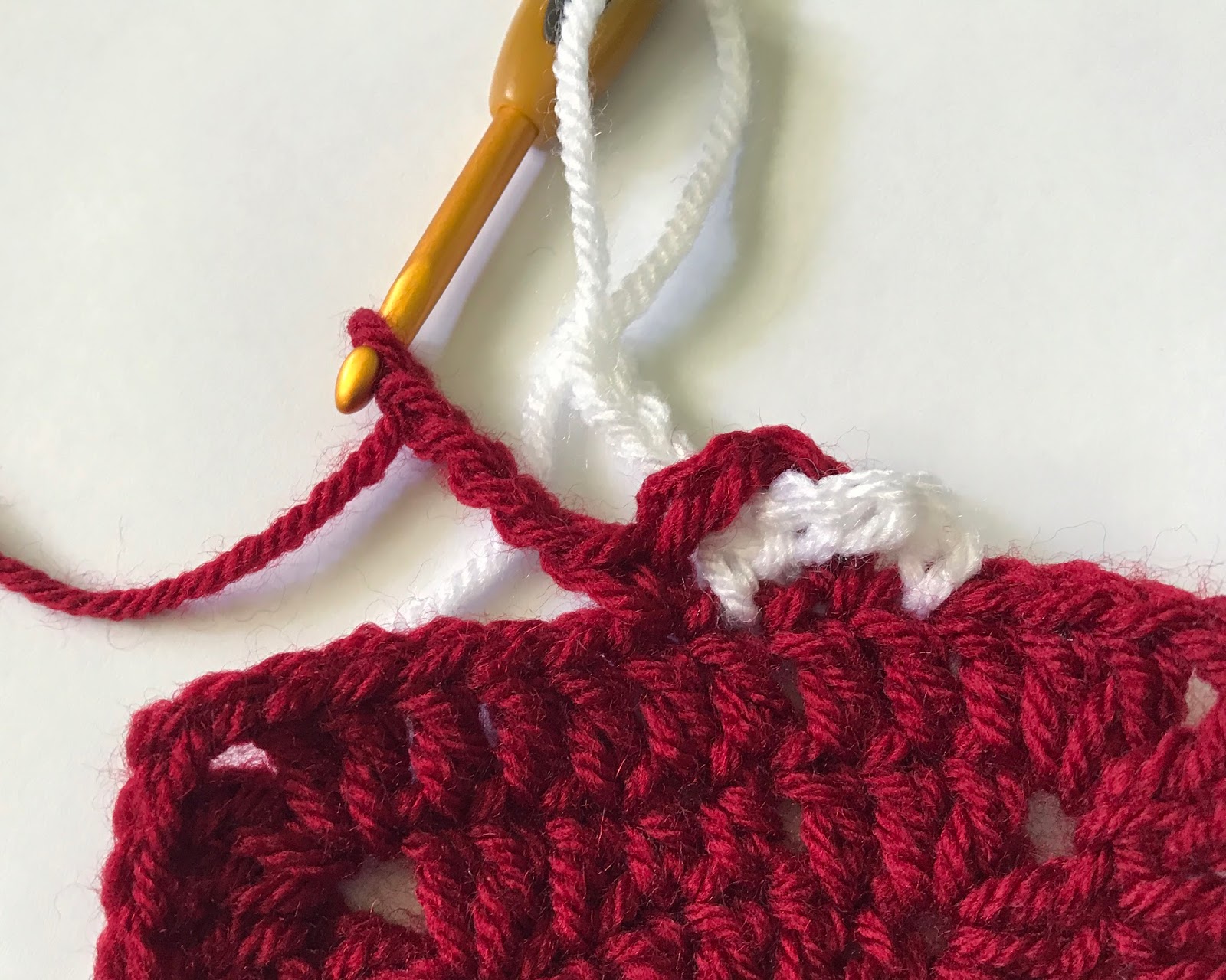Step 4: Go back to the cranberry yarn, single crochet into the next space after the white, chain up 4. (Photo 4)
